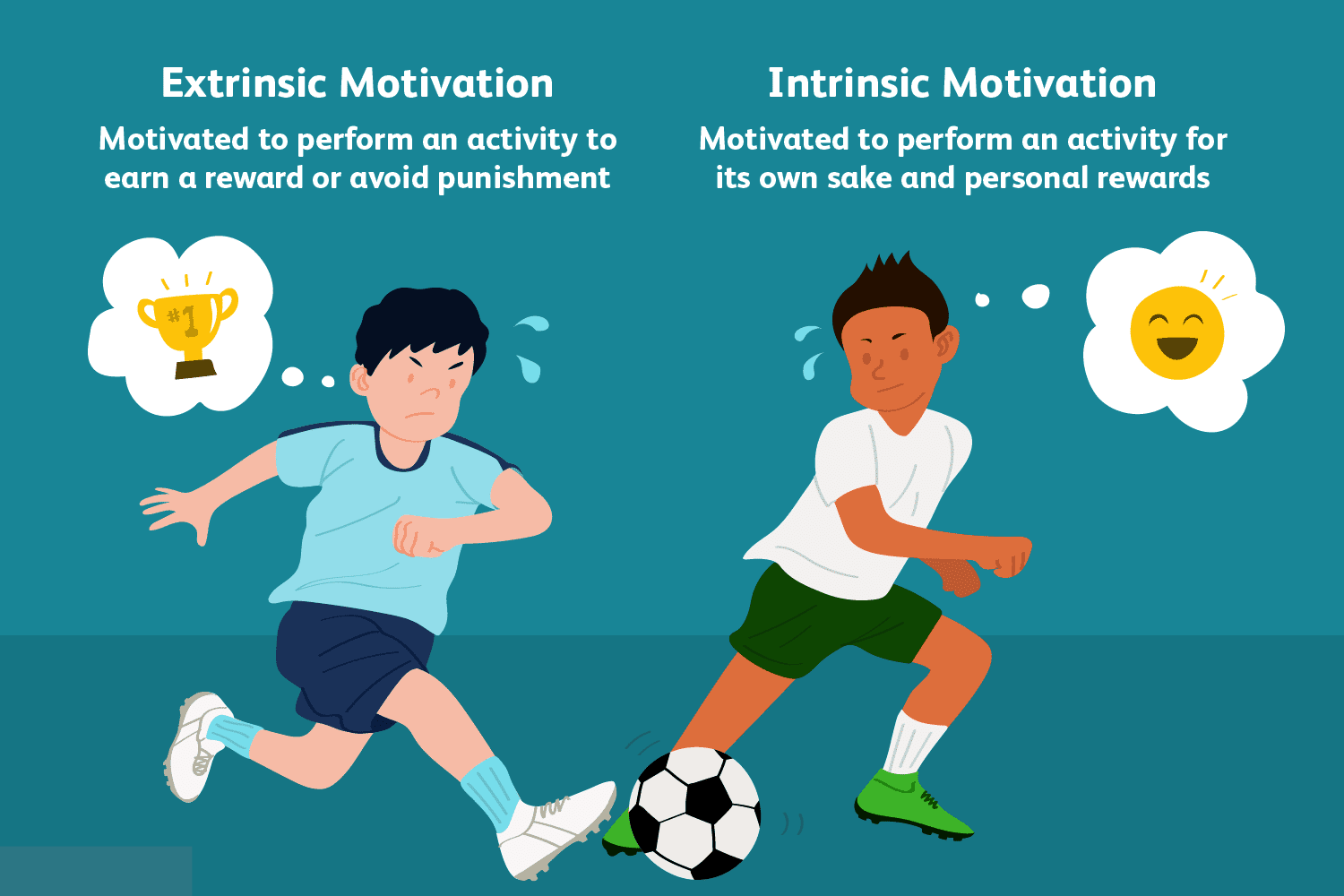Intrinsic, however, is an internal form of motivation. You strive towards a goal for personal satisfaction. You may even work towards a long-term reward such as participating in a competition, but the primary motivator is internal.