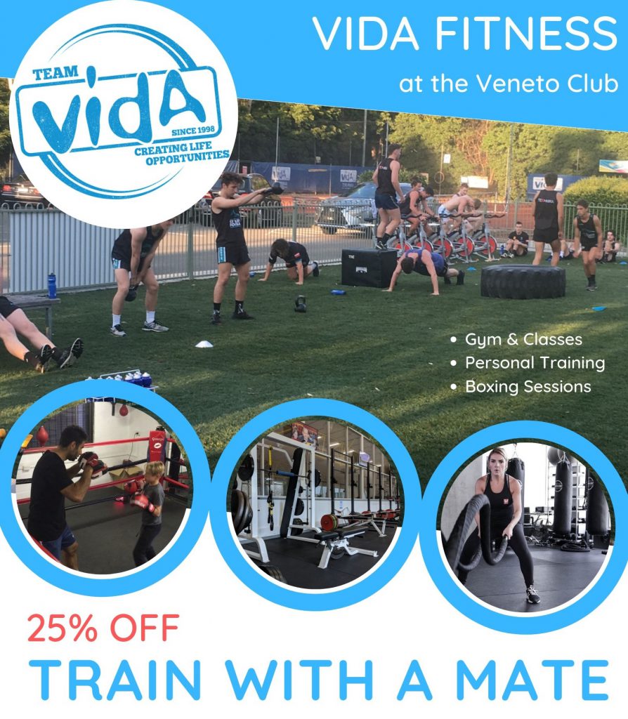Sign up for a Gym or Gym & Class Membership package and you and your mate will both receive 25% off. Click here to view all the membership options. To take up this offer, drop by the gym or email info@www.vidafitness.com.au